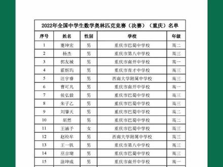 " 近日,中国数学会发布2022年全国高中数学联赛(重庆赛区)一等奖获奖公示名单。本次竞赛重庆市一等奖75人,具体获奖名单如下: 2022年全国中学生数学奥林匹克竞赛(预赛)(重庆赛区)一等奖名单 蹇坤宏男重庆市巴蜀..