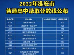 "2022年淮安市高中招生录取分数线已经公布,以下是具体内容: 学校代号 学校名称 30%统招分数线 统招分数线 1001 江苏省淮阴中学 738 728 1002 江苏省清江中学淮海北路主校区 712 711 1003 江苏省淮安中学 691 652 4..