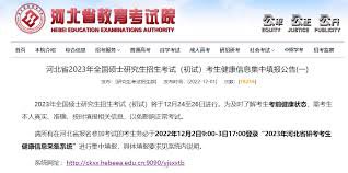 " 2023年全国硕士研究生招生考试(初试)将于12月24至26日进行。为了及时了解考生考前健康状态,需要考生本人真实、准确、按时填报相关信息,以免影响正常考试。请所有在河北省报名参加考试的考生务必于2022年12月2日9..